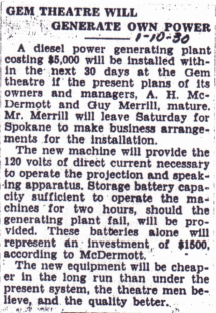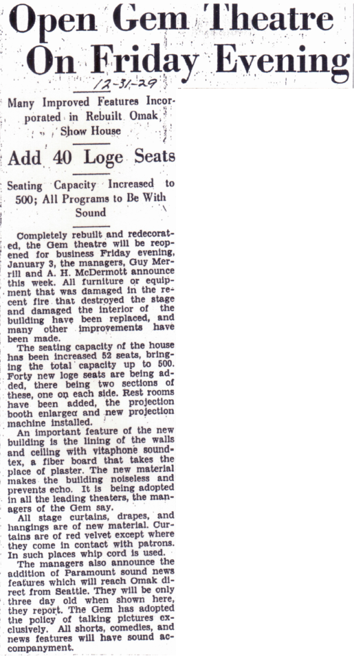 As had been promised, the rebuilt and redecorated Gem announced its scheduled re-opening for business. Closed for slightly less than a month after the fire, it boasted upgrades such as loge seats and improved sound. New policy: "talking pictures exclusively"