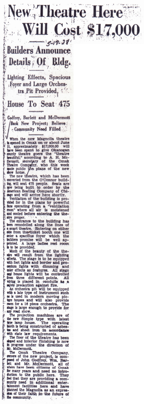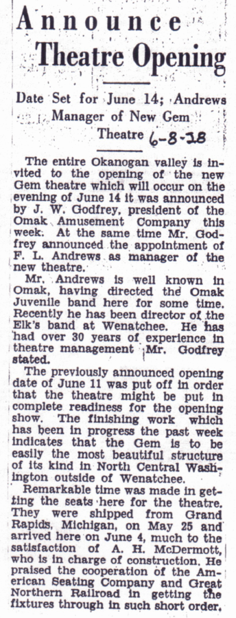 Originally planned to be called the Magnolia, the Gem Theatre opened in Omak on June 14, 1928. The 475 auditorium seats were built to order by the American Seating Company of Chicago, shipped from Grand Rapids Michigan and arrived in the "remarkable time" of 10 days via the Great Northern Railroad.